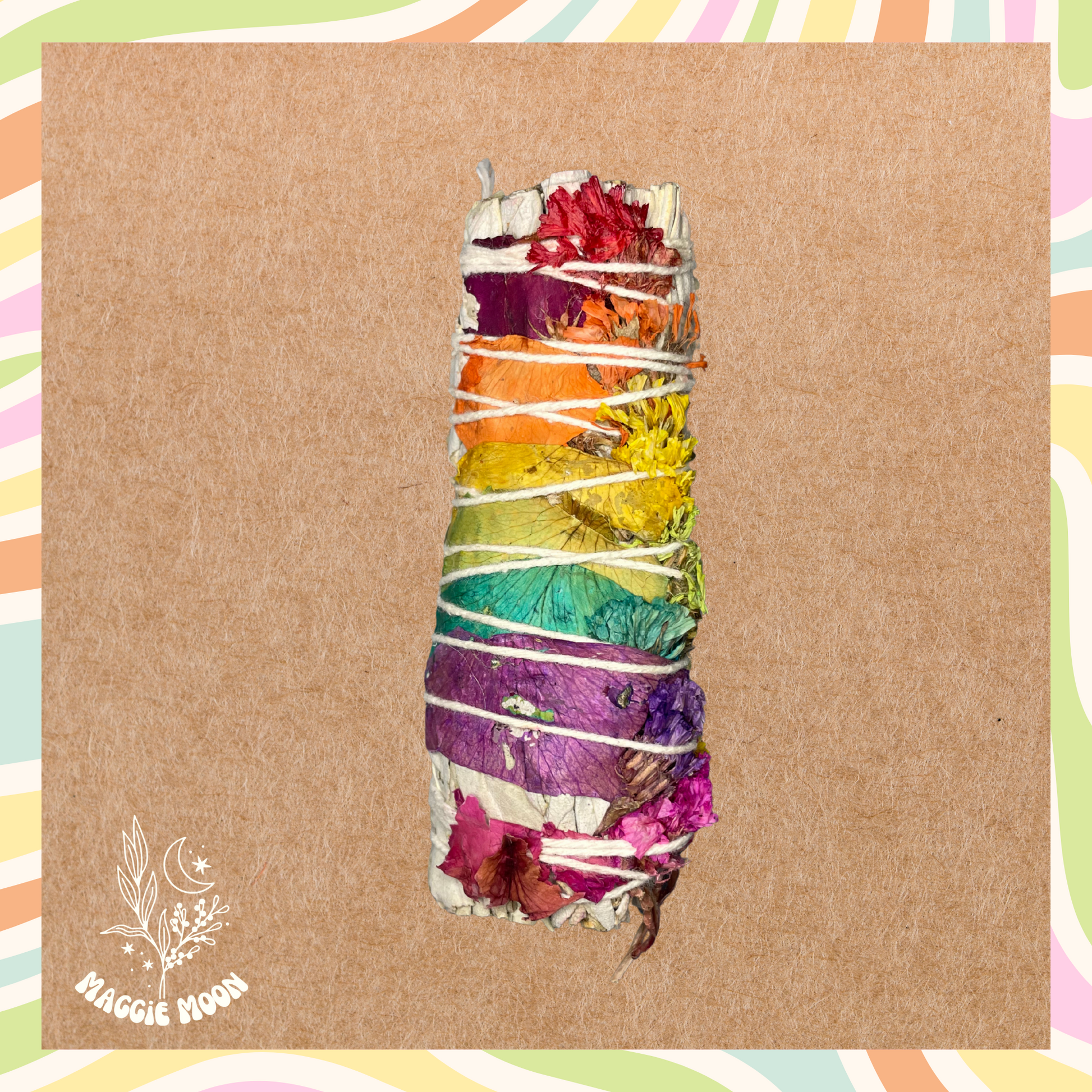 Handcrafted with sage and wrapped in coloured rose petals to represent the seven chakras, these smudge sticks are a powerful tool for cleansing and balancing energy. Each colour is tied to a different chakra, encouraging harmony from root to crown. As the smoke drifts, it clears negativity, open blockages, and restore flow within both your space and spirit.